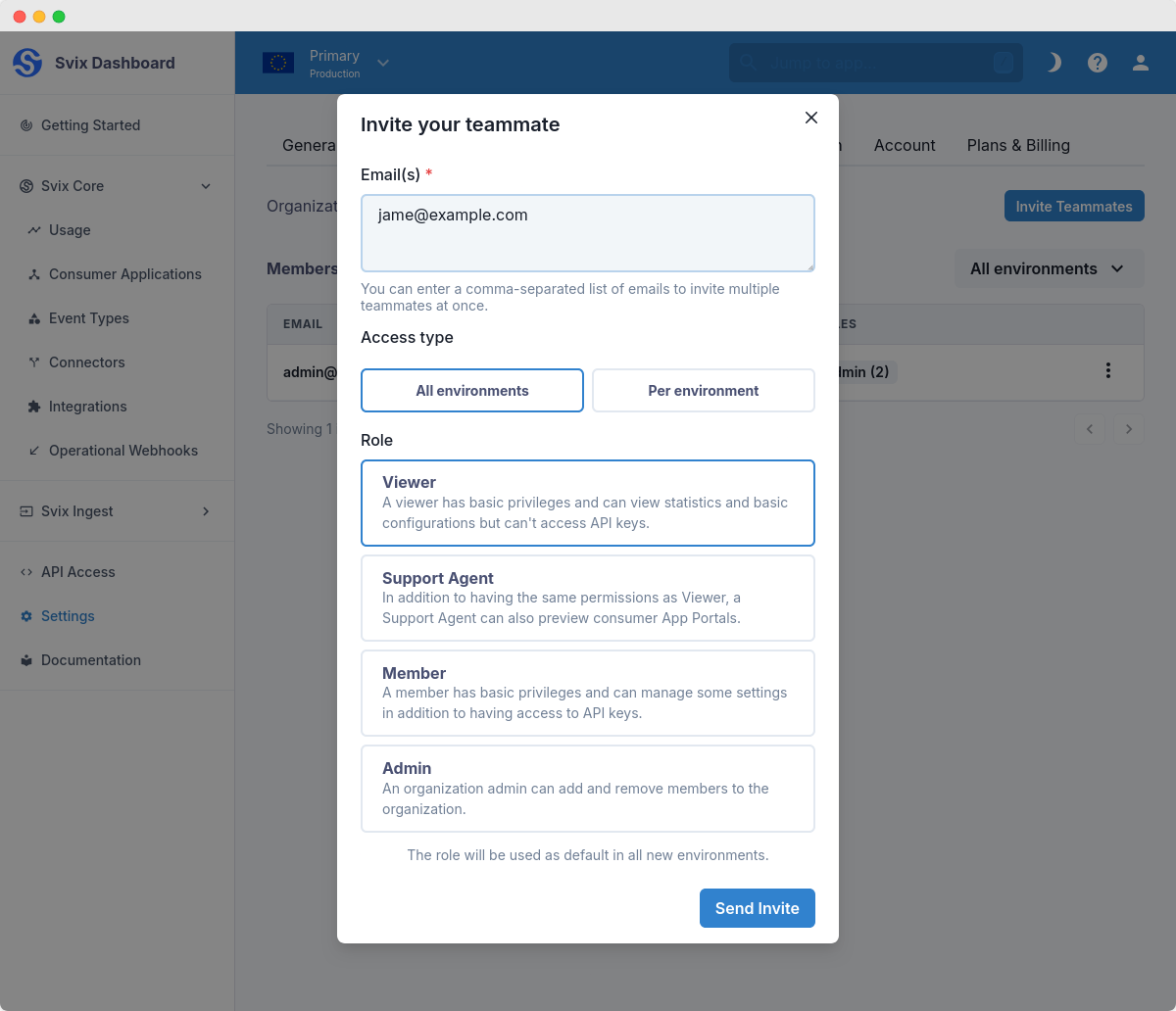 Support Agent is essentially a Viewer with the added ability to be able to preview consumer application portals directly from the dashboard. This makes it possible to give support agents the ability to access a user specific view directly from the Svix dashboard!