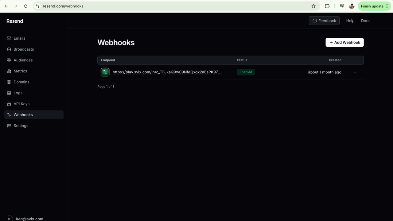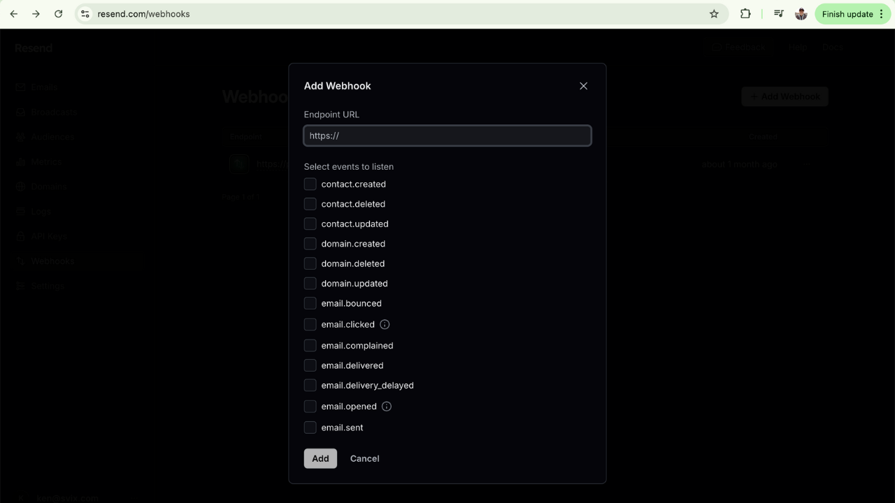 First, we set up a webhook in Resend's developer portal: