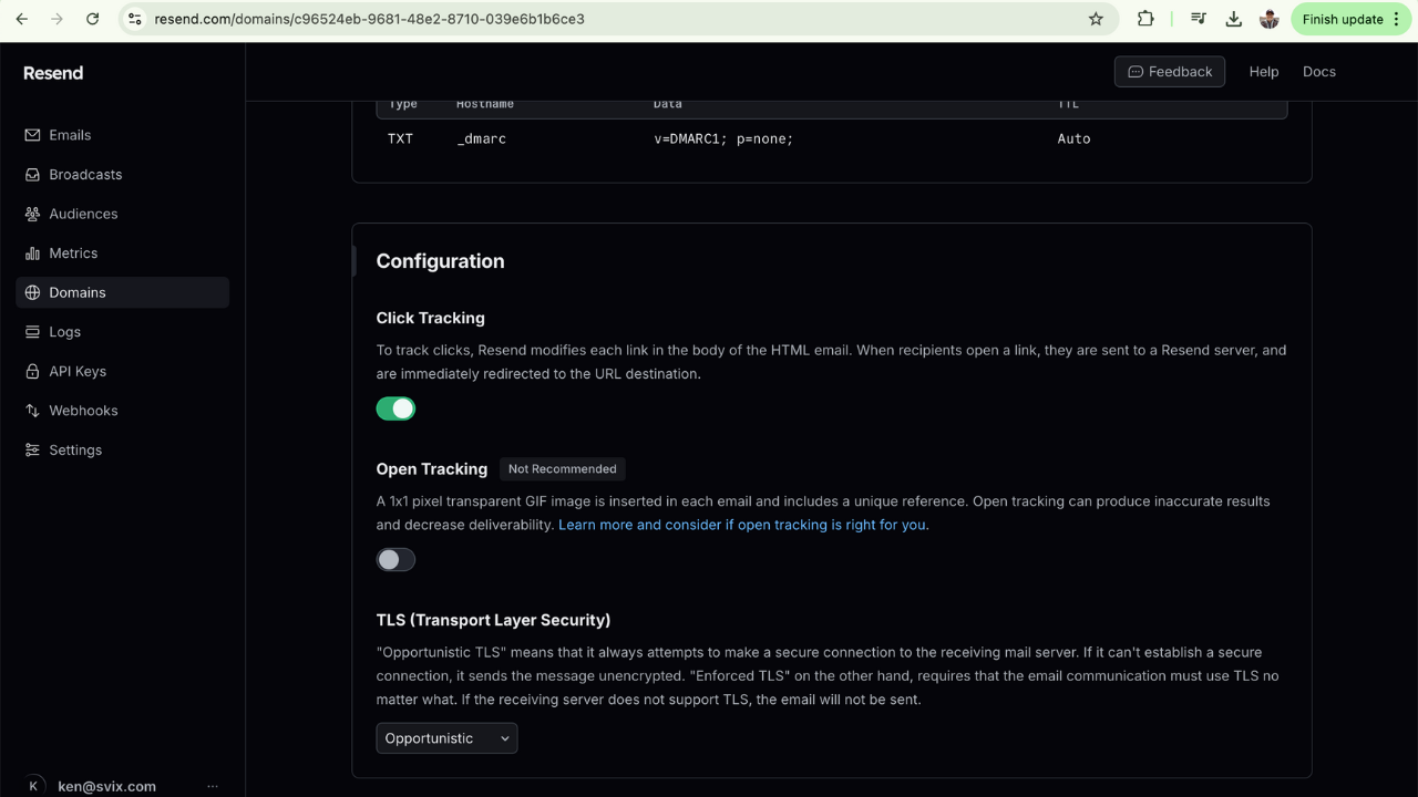 Ok, so for this demo we just checked off the email.clicked event. For email.clicked and email.opened, you'll need to set up tracking for the domain you're using to send emails with Resend. You can do so in the Domains tab. The configuration to enable open and/or click tracking is at the bottom of the page: